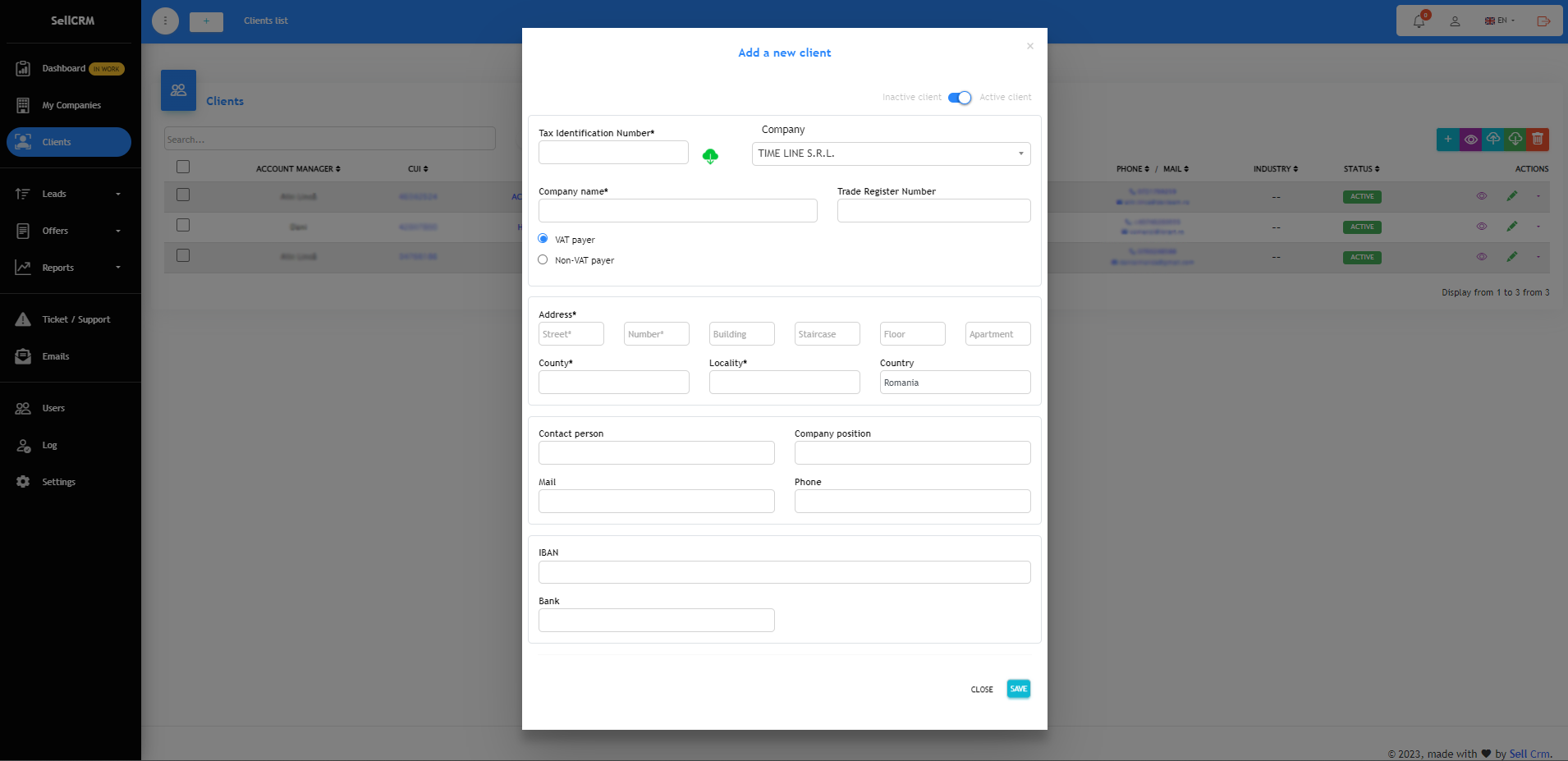 Client creation section let users create clients. Here you can add Tax idendification number, Trade register number, company, client name, specific address, contact person, position in the company, mail, phone, iban and bank