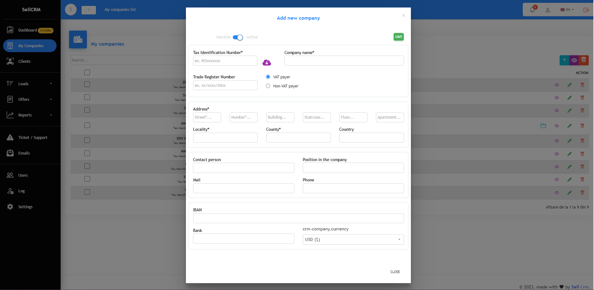 Company creation section let users create companies. Here you can add Tax idendification number, Trade register number, company name, specific address, contact person, position in the company, mail, phone, iban, bank and currency.